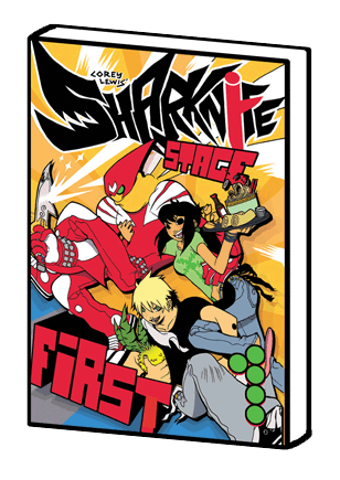 There's a LOT MORE where that came from!!! Talk about 100+ MORE PAGES of BOMBASTIC ACTION ANTICS in SHARKNIFE STAGE FIRST-- and a whole whopping 200+ pages in the smash hit sequel SHARKNIFE DOUBLE Z (right)!!! Discover indy comic's most endearing shark-themed super sentai HERO, SHARKNIFE!!